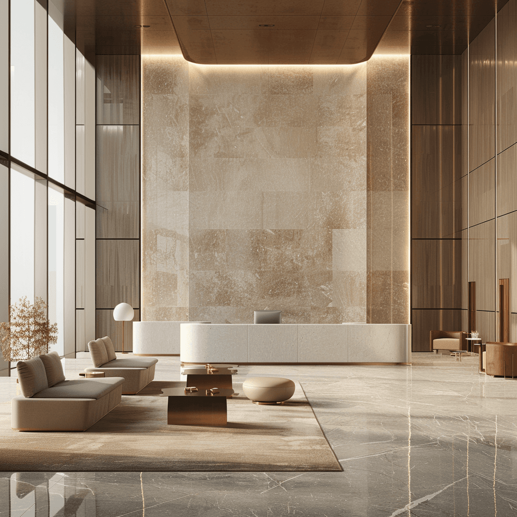 Warm, tactile materials - timber, textured surfaces, and soft metallic tones - balance the scale of the architecture with human comfort.