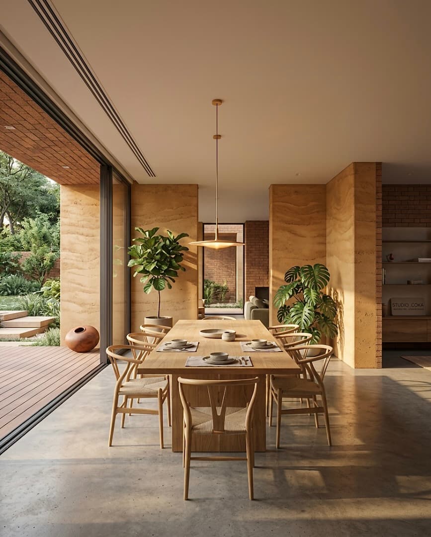 Rammed earth and compressed earth blocks are used not as aesthetic statements but as performance materials providing thermal mass, durability, and a grounded sensory experience.