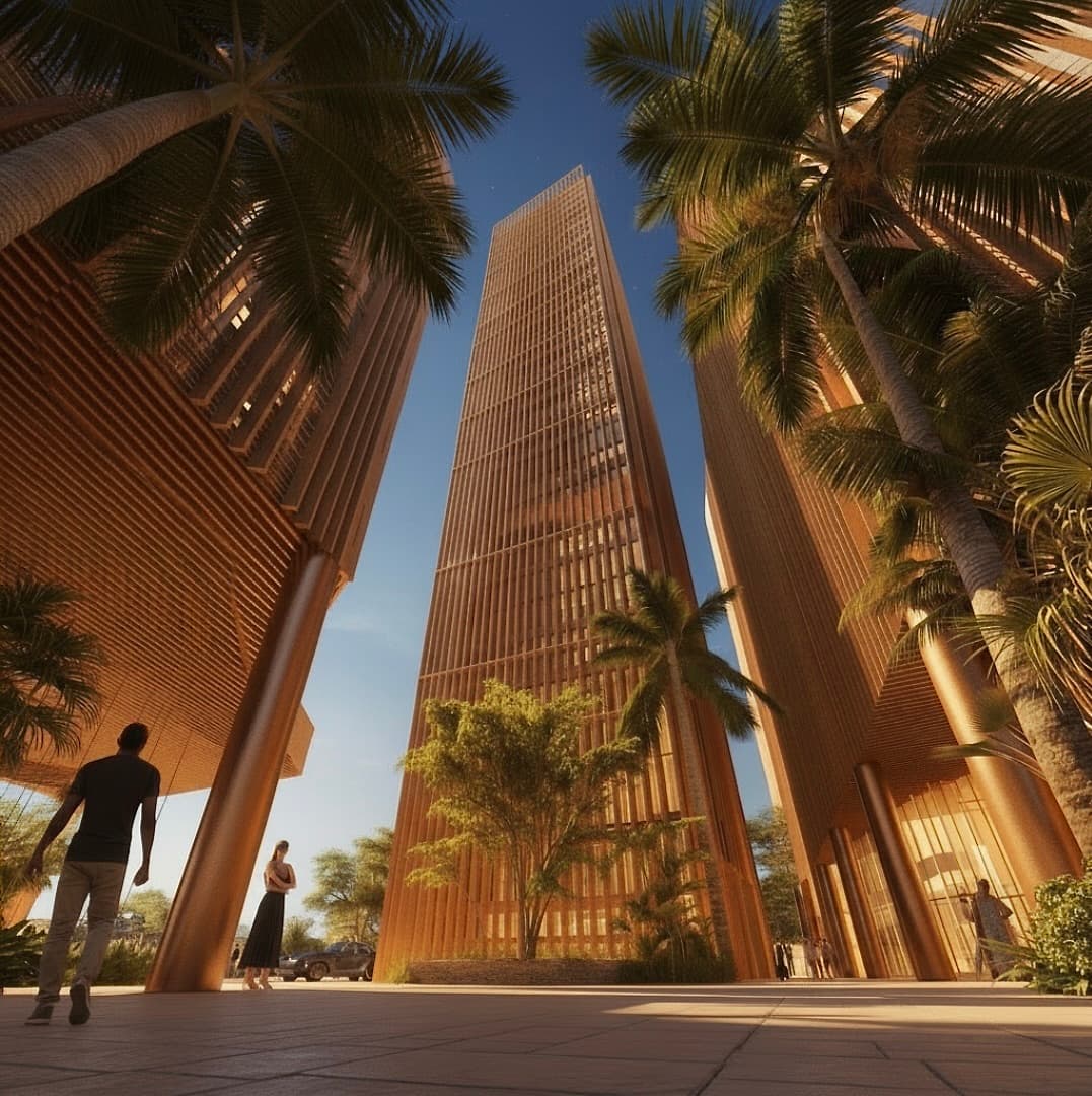 Warm, tactile materials are applied at scale, translating indigenous architectural language into a contemporary vertical form.