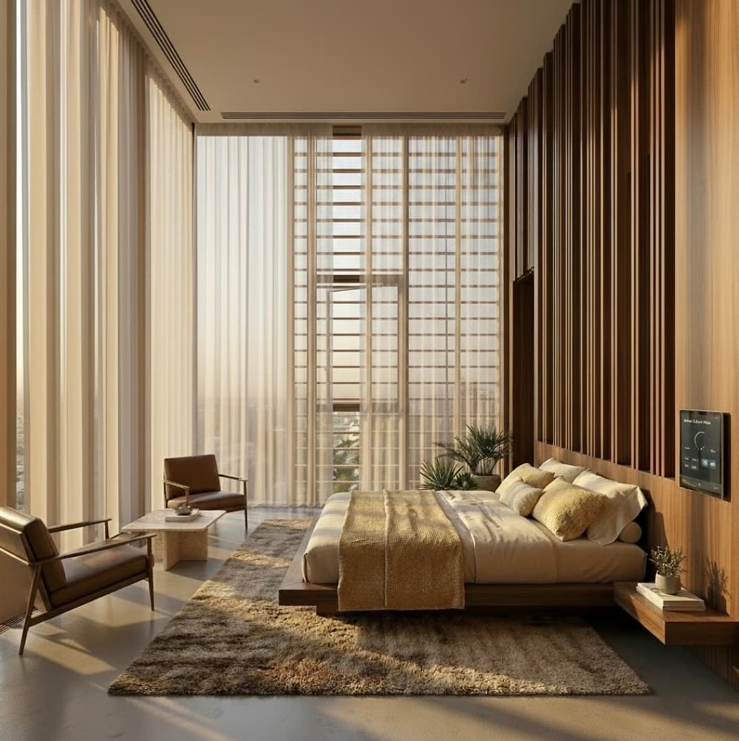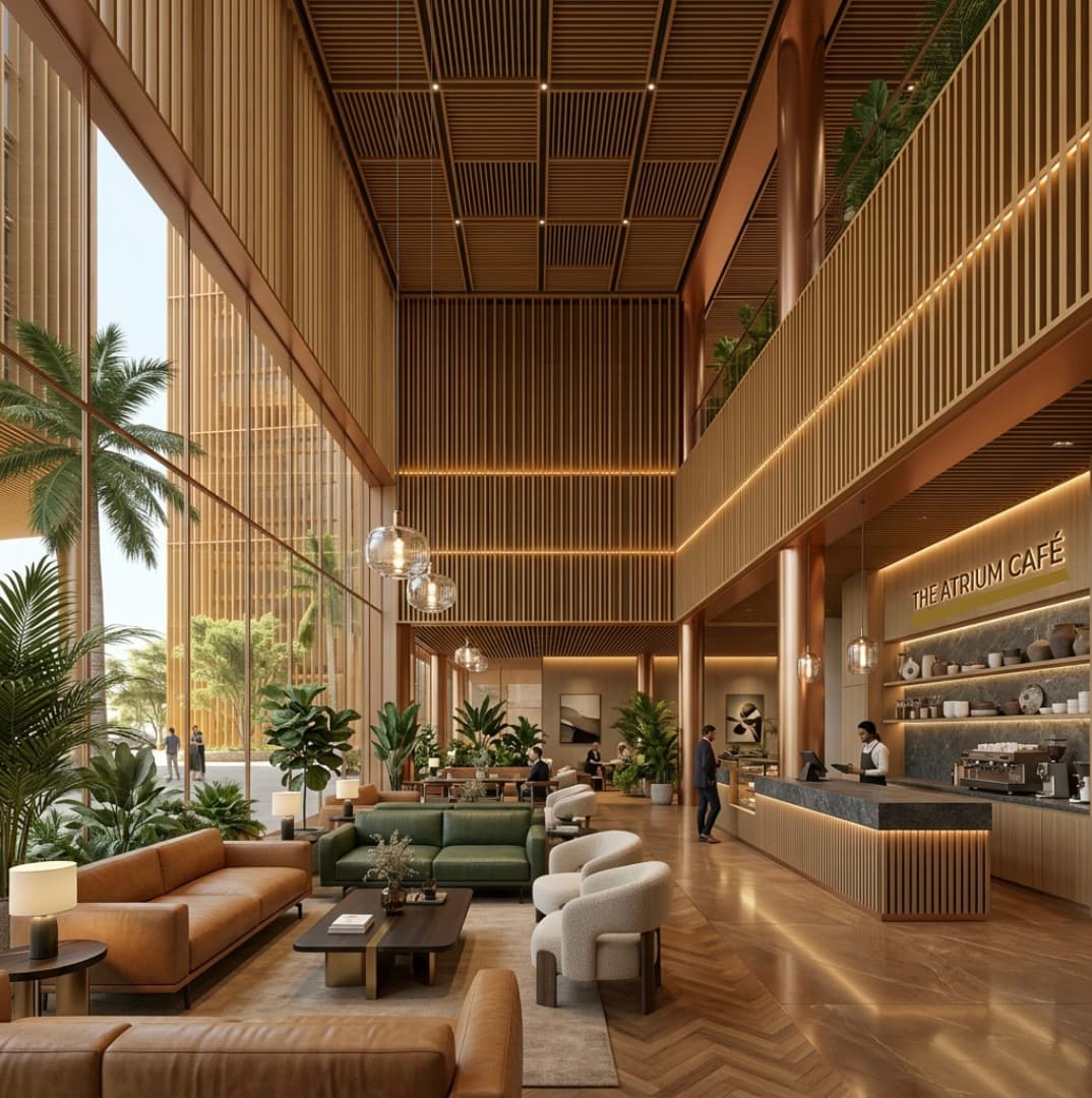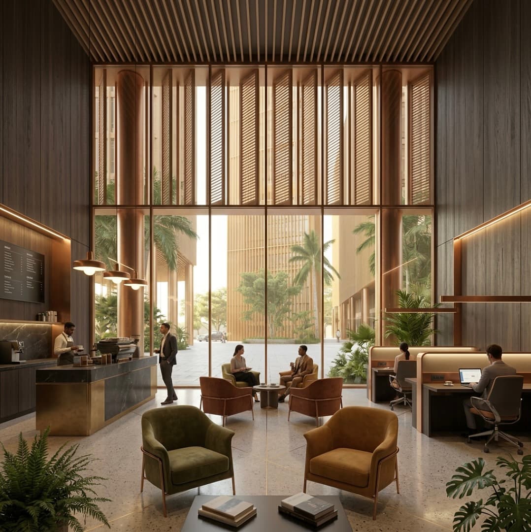 The towers are experienced as part of a larger living system rather than At ground level, spaces are open and inviting. Within the towers, vertical movement reveals layers of living, working, and social interaction. Light is filtered, air moves naturally, and materials remain warm and human despite the scale.