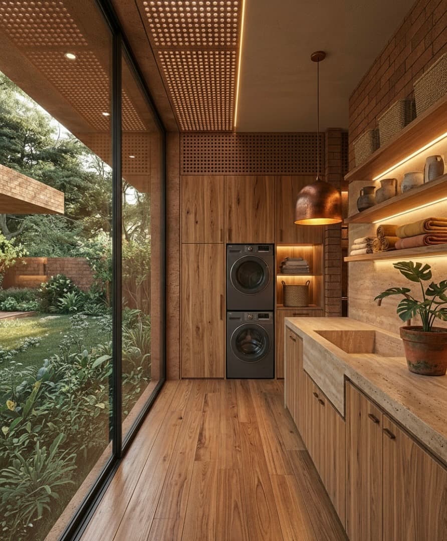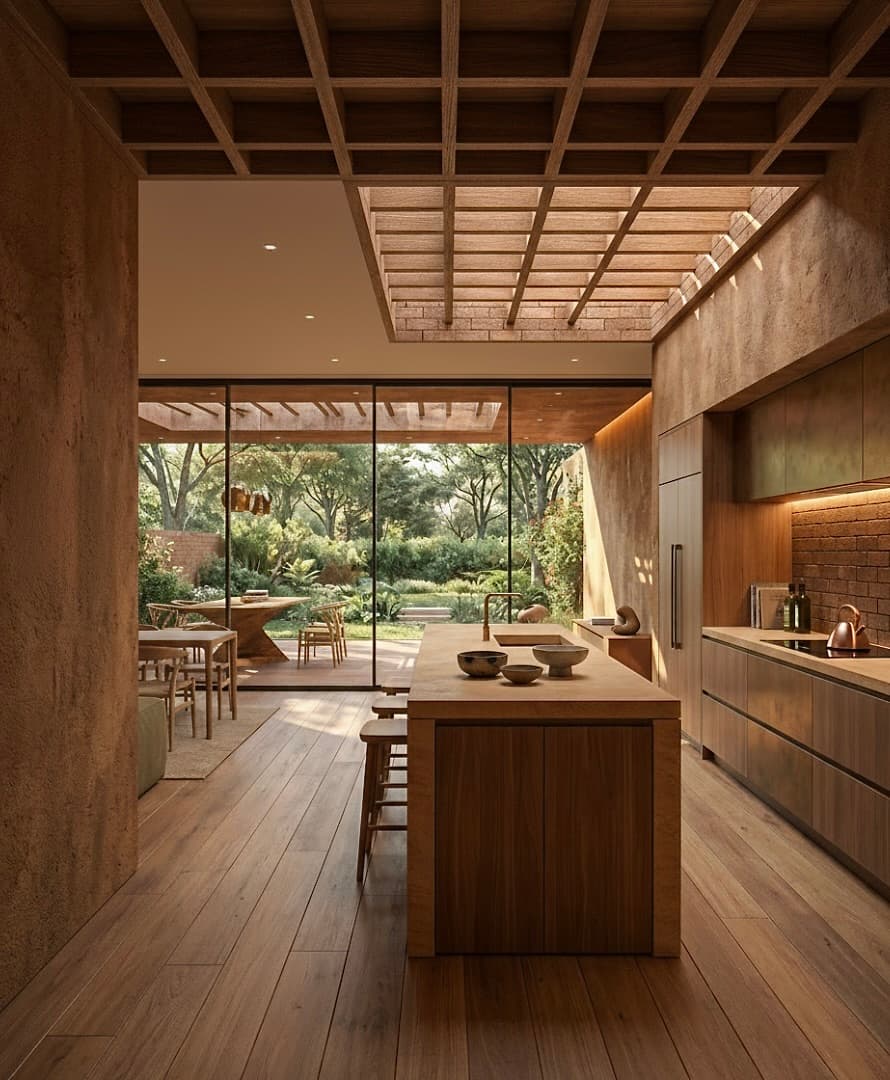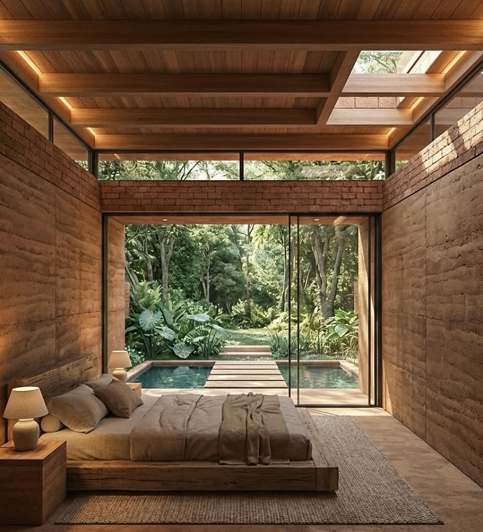 Rammed earth and compressed earth blocks are used not as aesthetic statements but as performance materials providing thermal mass, durability, and a grounded sensory experience.