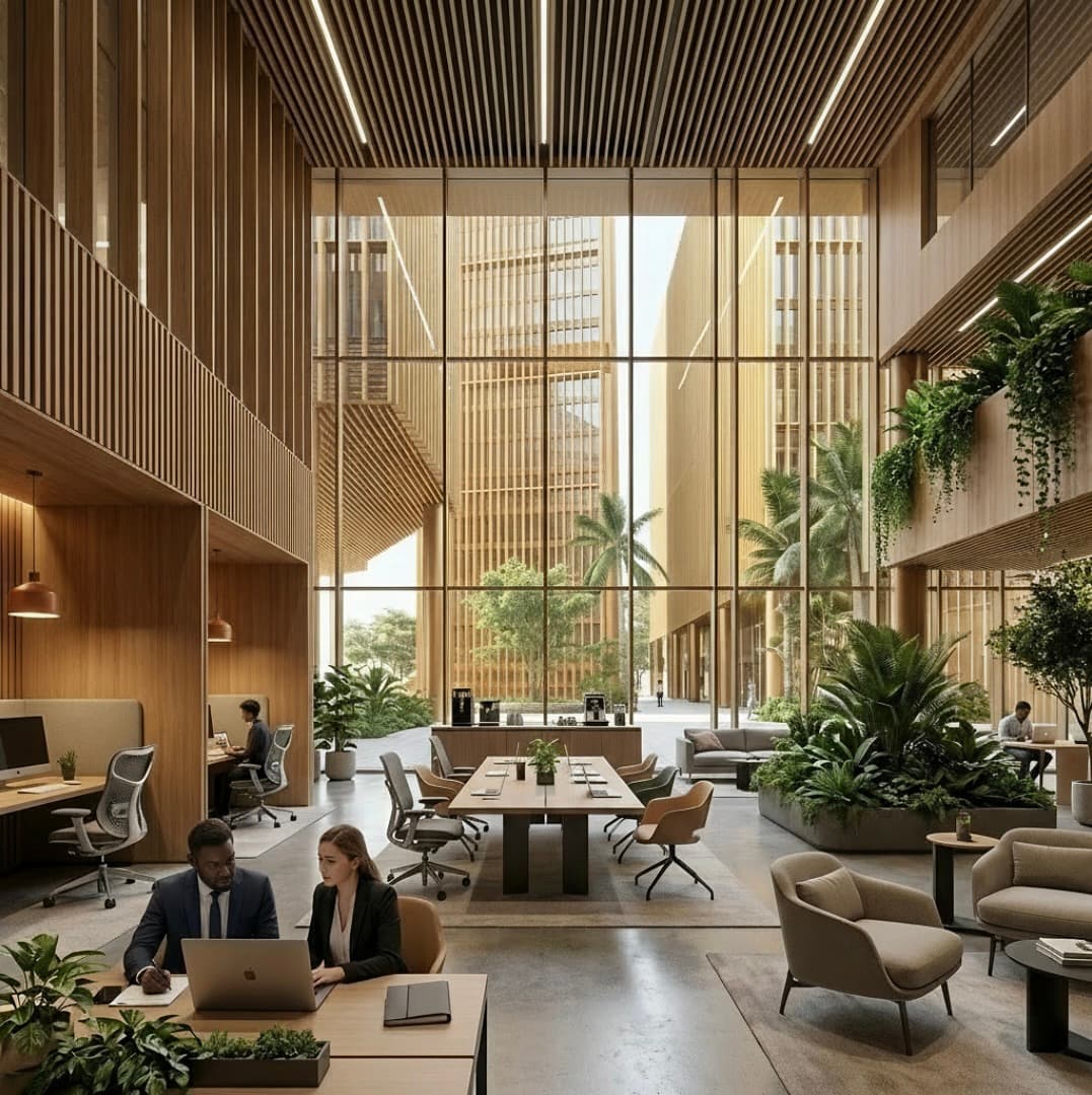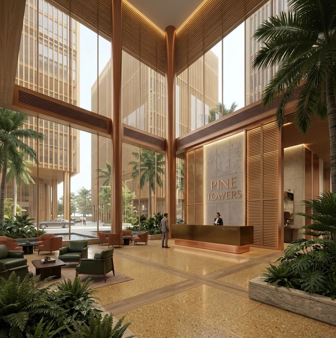 The towers are experienced as part of a larger living system rather than At ground level, spaces are open and inviting. Within the towers, vertical movement reveals layers of living, working, and social interaction. Light is filtered, air moves naturally, and materials remain warm and human despite the scale.